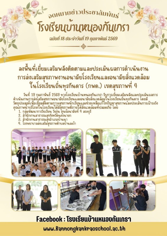 วันที่ 19 กุมภาพันธ์ 2569 ทางโรงเรียนบ้านหนองกันเกรา รับการเยี่ยมเสริมพลังและประเมินผลการดำเนินงานการส่งเสริมสุขภาพอนามัยโรงเรียนและอนามัยสิ่งแวดล้อมในโรงเรียนถิ่นทุรกันดาร โดยมีวัตถุประสงค์เพื่อเยี่ยมติดตามภาวะสุขภาพนักเรียนและช่วยเหลือแก้ไขปัญหาสุขภาพและประเมินการเฝ้าระวังคุณภาพน้ำบริโภคในโรงเรียนได้มีสุขภาพดีภายใต้สิ่งแวดล้อมที่ปลอดภัย โดย
