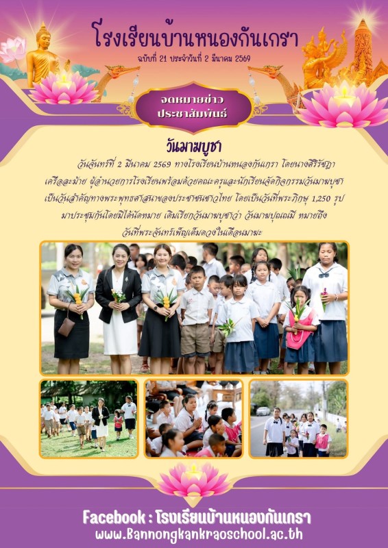 วันจันทร์ที่ 2 มีนาคม 2569 ทางโรงเรียนบ้านหนองกันเกรา โดยนางศิริรัชฎา เครือละม้าย ผู้อำนวยการโรงเรียนพร้อมด้วยคณะครูและนักเรียนจัดกิจกรรมวันมาฆบูชา เป็นวันสำคัญทางพระพุทธศาสนาของประชาชนชาวไทย โดยเป็นวันที่พระภิกษุ 1,250 รูป มาประชุมกันโดยมิได้นัดหมาย เดิมเรียกวันมาฆบูชาว่า วันมาฆปุณณมี หมายถึง วันที่พระจันทร์เพ็ญเต็มดวงในเดือนมาฆะ